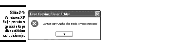 Zaštita od upisivanja bi trebalo da bude korisna bezbednosna mera, ali je mnogi otkrivaju kao iznenadnu neljubaznost računara: dok pokušavaju da kopiraju datoteku na disketu ili kompakt disk, Windows XP ih zaustavlja upozoravajućom porukom prikazanom na slici 2-1.