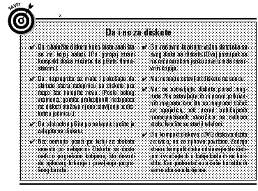 Disketa zaštićena od upisivanja je tako podešena da na nju niko ne može da kopira podatke niti da obriše datoteke koje ona sadrži. Zaštita od upisivanja je jednostavna procedura i, iznena?ujuće, ne zahteva nikakvo posebno odobrenje vlasti. Disketu možete zaštititi i zaštitu ukloniti u privatnosti svoje kuće.