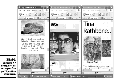 Većina novih računara ima ugra?ene modeme, kako biste uživali blagodeti World Wide Weba. U stvari, ako ste nabavili nov računar, verovatno već imate sve što vam je neophodno da se povežete na Internet. Windows XP ima ugra?en program pod imenom Internet Explorer kojim pokrećete sve ove delove. Njime možete da pretražujete lokacije na Webu ili da prekrijete radnu površinu, kao što je prikazano na slici 2-2, dajući joj ultramoderan izgled Web stranice. Brojna umetnička dela sa lokacija na Webu prekriće vašu radnu površinu, kao posteri pariske ulice.