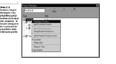 Biblioteku koju napravite, kao i probni projekat, možete pomoću Project Managera da dodate istoj projektnoj grupi. Pritisnite tastere Alt+V, P da biste iz menija View otvorili Project Manager. Pritisnite Project Manager desnim tasterom miša i iz priručnog menija (slika 2.5) izaberite dodavanje novog (Add New Project) ili nekog već postojećeg (Add Existing Project...) projekta.