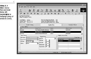 Grafičko radno okruženje sadrži vizuelne efekte koji se postižu kombinovanjem koda i podataka iz različitih resursa, kao što su slike, video i audio sekvence, fontovi i boje. Pošto je Delphi objektno orijentisan jezik, već postoji možda desetine hiljada komponenata pisanih u izvornom kodu, a još mnogo će ih biti napravljeno. Delphijevo okruženje se dovoljno lako koristi, pa bi i umetnik (koji nije programer) mogao u njemu da za vašu aplikaciju pravi remek-dela. Jedan primer privlačnog grafičkog okruženja vidite na slici 2.1. To je Web strana za softverski proizvod PensionGold, napravljena u Delphiju. Kada se uzme u obzir važnost vizuelnih efekata, prosto je neverovatno koliko malo kompanija zapošljava profesionalne umetnike za dizajniranje grafičkog okruženja.