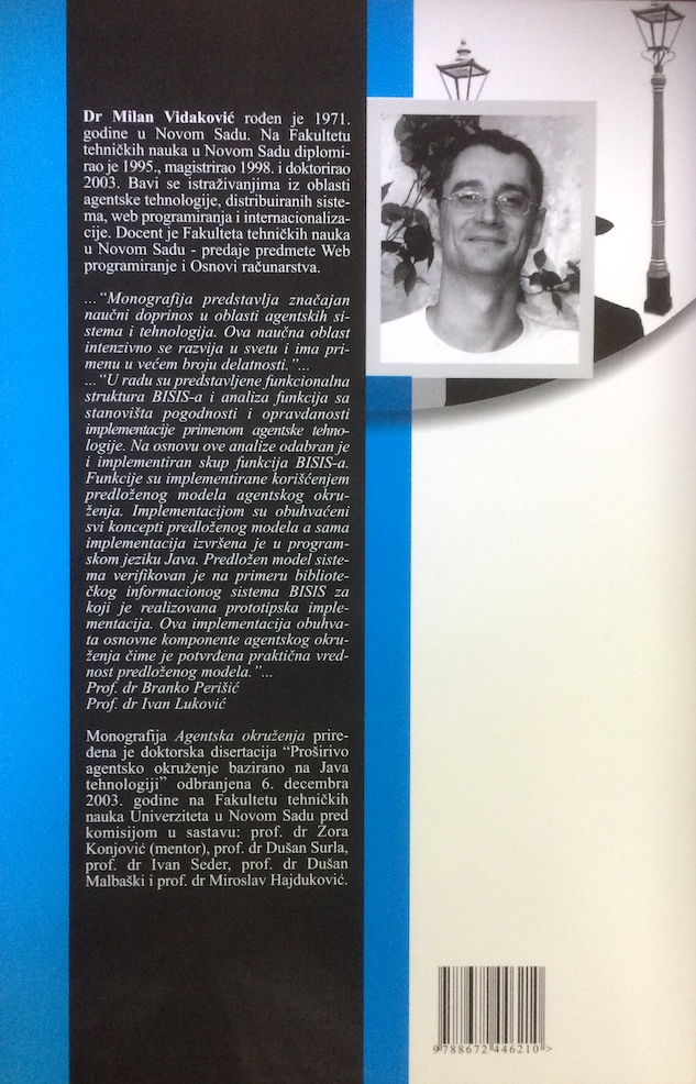 Monografija predstavlja značajan naučni doprinos u oblasti agentskih si-stema i tehnologija. Ova naučna oblast intenzivno se razvija u svetu i ima pri-menu u većem broju delatnosti. ”...