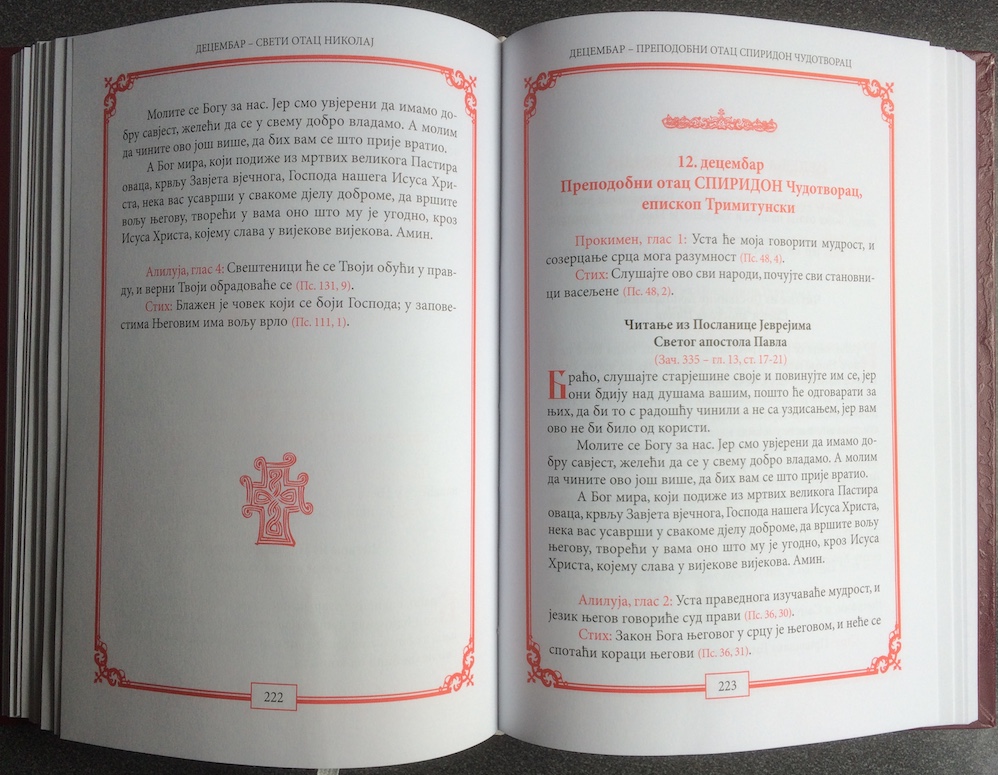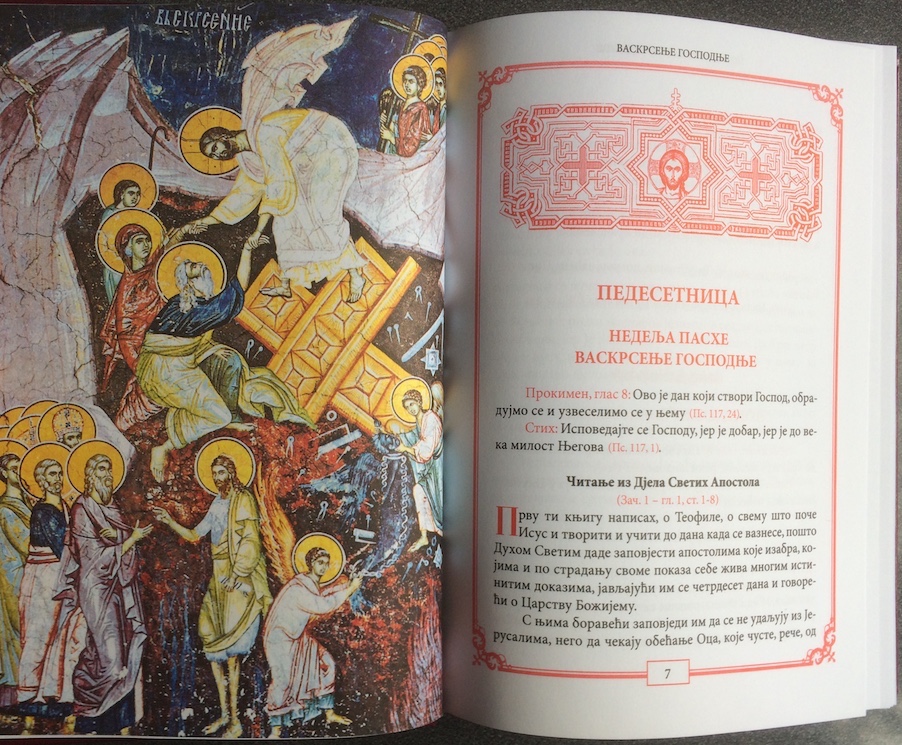 С благословом Његове Светости Архиепископа пећког, Митрополита београдско-карловачког и Патријарха српског Господина ИРИНЕЈА и чланова Светог архијерејског синода Српске православне цркве Митрополита црногорско-приморског АМФИЛОХИЈА, Епископа бачког ИРИНЕЈА, Епископа далматинског ФОТИЈА, Епископа захумско-херцеговачког ГРИГОРИЈА одштампа се ова СВЕШТЕНА КЊИГА АПОСТОЛ.