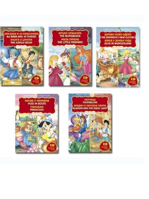 Ova interaktivna izdanja omogućiće vašoj deci da na što zabavniji način nauče engleski jezik, a da pri tom uživaju u svojim omiljenim bajkama. Svaka knjiga serijalaPročitaj mi bajku predstavlja kvalitetnu audio-vizelnu celinu, zabavni i umetnički doživljaj sa velikom edukativnom notom. Savremen dizajn, preglednost i zanimljive ilustracije su nešto što bajke iz ove edicije izdvaja od ostalih i koje se preporučuju kako deci, tako i roditeljima za zajedničko druženje. Možda najzanimljiviji segment edicije je audio CD koji se dobija na poklon uz svaku knjigu. Na CD-u se nalaze interpretacije bajki na srpskom jeziku koje čita Dragoljub Ljubičić Mićko, i na engleskom ih interpretira Ana Sofrenović. Nezaobilazan detalj svakog odrastanja su bajke. Dozvoliti svom detetu da uz iste bajke odraste i nauči sve što su i njihovi roditelji u svom detinjstvu, i to na mnogo zabavniji način i zajedno sa njima, od izuzetne je važnosti za odrastanje deteta. Ispričane razumljivim i jednostavnim jezikom i prilagođene svim uzrastima, bajke iz ove edicije u najboljem maniru pripovedačke tradicije prenose univerzalna i vanvremenska značenja. U posebnom delu na kraju svake knjige data su objašnjenja pojmova i rečnik engleskih reči. 1. Ali baba/Knjiga o džungli Knjiga na srpskom i engleskom jeziku sa popularnim bajkama Ali baba i Knjiga o džungli, a uz knjigu dolazi i audio CD gde bajke čitaju Ana Sofrenović i Dragoljub Ljubičić Mićko, kao i rečnik osnovnih reči i pojmova. 2. Krcko Oraščić/Mala sirena Knjiga na srpskom i engleskom jeziku sa popularnim bajkama Krcko Oraščić i Mala sirena, a uz knjigu dolazi i audio CD gde bajke čitaju Ana Sofrenović i Dragoljub Ljubičić Mićko, kao i rečnik osnovnih reči i pojmova. 3. Carevo novo odelo/Alisa u zemlji čuda Knjiga na srpskom i engleskom jeziku sa popularnim bajkama Carevo novo odelo i Alisa u zemlji čuda, a uz knjigu dolazi i audio CD gde bajke čitaju Ana Sofrenović i Dragoljub Ljubičić Mićko, kao i rečnik osnovnih reči i pojmova. 4. Mačak u čizmama/Pinokio Knjiga na srpskom i engleskom jeziku sa popularnim bajkama Mačak u čizmama i Pinokio, a uz knjigu dolazi i audio CD gde bajke čitaju Ana Sofrenović i Dragoljub Ljubičić Mićko, kao i rečnik osnovnih reči i pojmova. 5. Palčica/Aladin i čarobna lapma