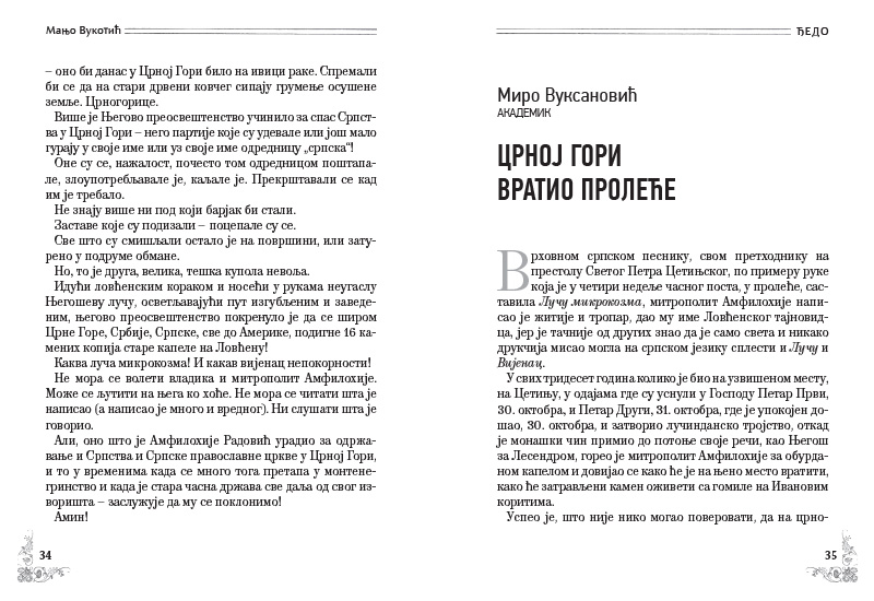 Шта је све урадио, какве нам дарове и завештања оставио, сазнаћете из текстова у овој књизи, које су потписали: владика Јоаникије, Матија Бећковић, Емир Кустурица, владика Григорије, Петар Божовић, Војислав Коштуница, Јован Делић, Мило Ломпар, владика Јован, Миро Вуксановић, Часлав Копривица, Драган Хамовић, Будимир Дубак, Иван Негришорац, Драган Лакићевић, Гојко Перовић, Велибор Џомић, Андрија Јовићевић, Комнен Бећировић, Милош Ковић, Јован Маркуш, Желидраг Никчевић, Мањо Вукотић, Раде Драговић.