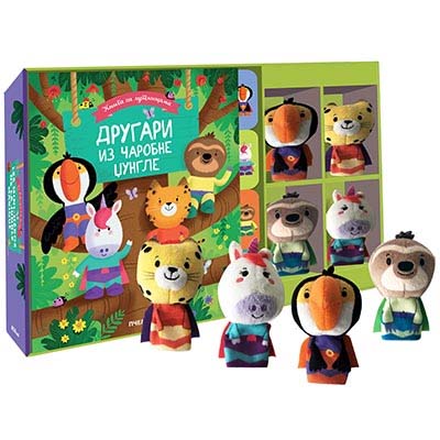 Књигу са луткицама ДРУГАРИ ИЗ ЧАРОБНЕ ЏУНГЛЕ чине четири луткице – тукан Кика, једнорог Лиза, лењивац Тео и леопард Лиза. Сваки од ова четири другара главни је јунак једне приче, коју ћете моћи изнова да читате и оживљавате њене ликове.