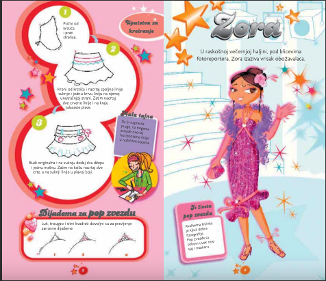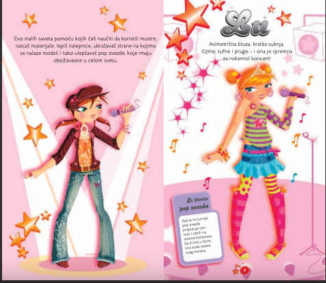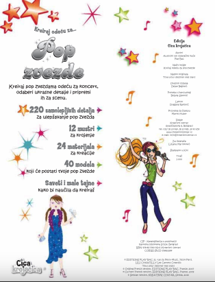 Kreiraj pop zvezdama odeću za koncert, odaberi ukrasne detalje i pripremi ih za scenu. U torbici ćeš naći 220 samolepljivih detalja za ulepšavanje pop zvezda, 12 mustri za krojenje, 24 materijala za kreacije, 40 modela koji će postati tvoje pop zvezde i savete i male tajne kako bi naučila da kreiraš