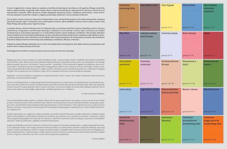 Zamislite skoro 3000 najznačajnijih i najuticajnijih umetničkih dela iz čitavog sveta, okupljenih na jednom mestu. Sada zamislite da vas u obilazak takve kolekcije vode najugledniji kustosi, istoričari umetnosti i arheolozi kao vaši lični vodiči. Posle deset godina pripreme, uz udruženu stručnost globalnog tima od 100 specijalista, među kojima su mnogi najugledniji svetski stručnjaci za umetnost, Muzej umetnosti je vaša ulaznica za najveću umetničku kolekciju ikada okupljenu u jednoj knjizi.