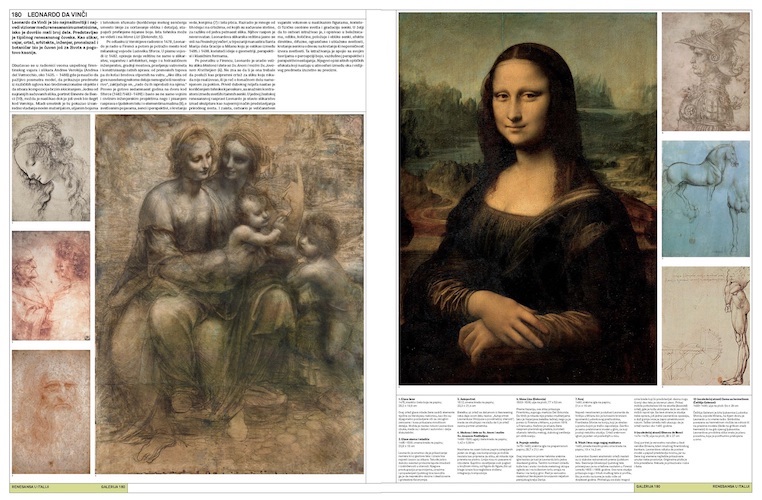 Ogromne stranice su savršeno uređene kako bi pružile posmatraču što više detalja. Na dvostrukom listu u galeriji italijanske renesanse, na primer, Mona Liza je okružena nizom crteža i skica Leonarda da Vinčija, a svi oni jasno pokazuju kvalitet svetosti i prostora u njegovom delu. Čitava stranica u ovom odeljku je odvojena za manje poznatu Damu sa hermelinom i Đinevru di Benči, izvanredne portrete čije odlike su naglašene velikim formatom.