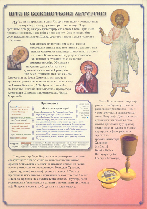 Жеља нам је да уз помоћ овог Приручника и кроз разговоре о вери народ упозна са свим лепим и душекорисним аспектима учествовања у Божанственој Литургији а од новца прикупљеног продајом овог Приручника, штампало би се друго и следећа издања.