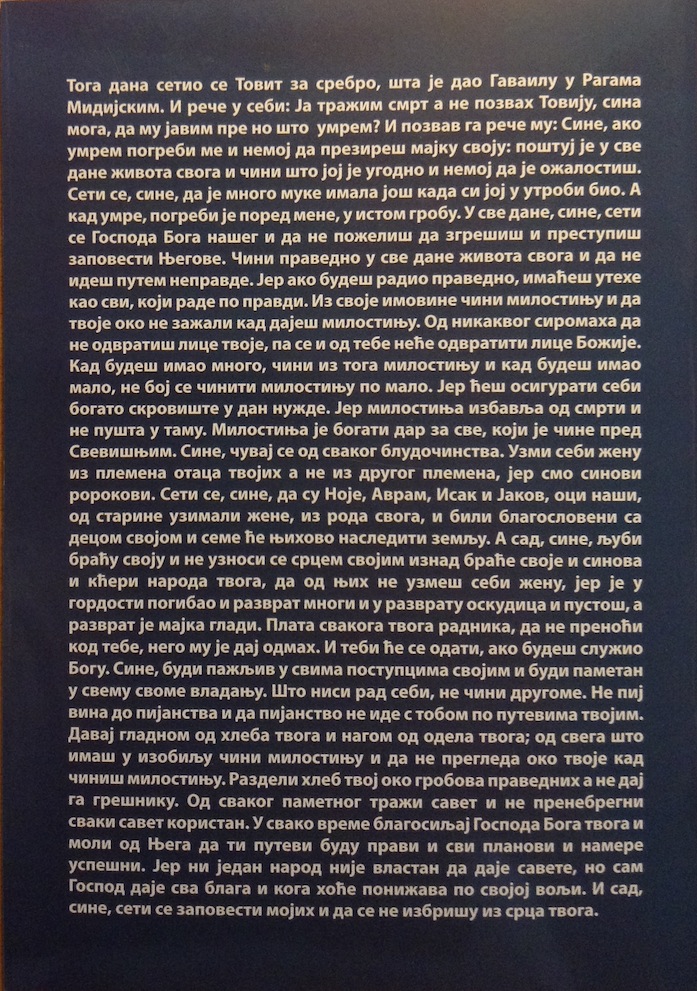 Товит је прави пример како би се ваљало владати у свету. И за очеве, и за синове и за следећа покољења. Ту први пут чујемо и једну од највећих заповести хришћанских: Што ниси рад себи, не чини другоме.