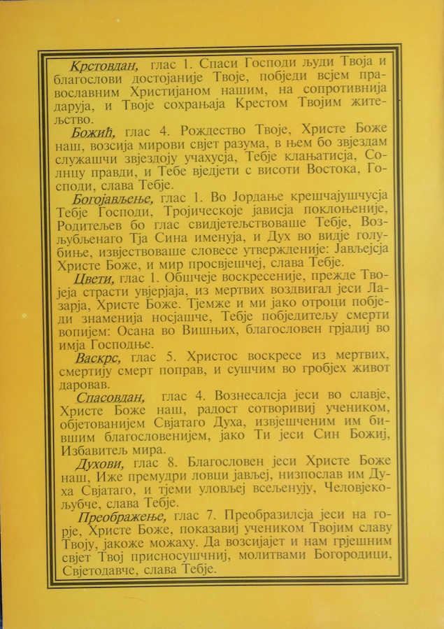 Међутим, пошто већина верника не разуме најбоље црквенословенски језик, овај Зборник ће. надамо се, ипак помоћи да се разуме оно што се пева о одређеном светитељу па ће тaко и само појање имати другачији осећај и смисао. Мишљење приређивача овог Зборника је да се понекад отпевају неки тропари и кондаци и на Србском језику (као и остале Богослужоене песме), али да се никад Васкршњи, Божићни или неки други тропар великом празнику или великом светитељу не певajy Србским језиком, јер нити се речи превода могу најбоље уклопити у мелодију гласа, нити се тада може доживети оно осећање, као кад се пева на црквенословенском језику. Онај ко је то доживео, ко је у бдењу дочекао Васкршње јутро, и пред затвореним вратима храма запевао Христос Воскресе зна шта то значи.