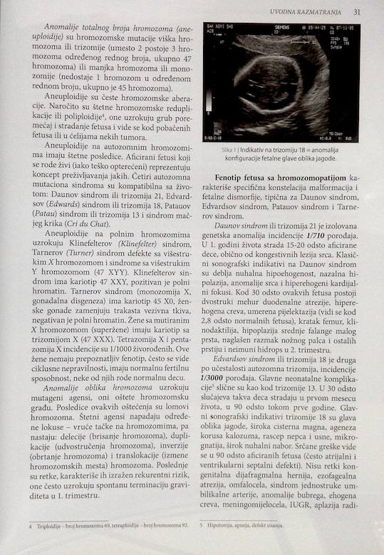Metodski određeni na inicijalnom konceptu avangarde komentari materije prilagođeni su iskustvu konvencionalnog izlaganja principa ultrazvučne ekspertize fetusa u nastojanju da se fetalnom sonogramu na merodavan način dodeli prostor u skladu sa značenjem za fetomaternalnu medicinu. Prenatalni skrining graviditeta postavlja se kao dijagnostička osnova u detekciji multifetalne gestacije, placente previje, intrauterine restrikcije rasta, postmaturiteta i, naročito, malformisanog fetusa. Fetalne anomalije dijagnostikuju se u preko 50 odsto spontanih pobačaja i u 2-4 odsto živorođene dece. Hromozomopatije su čest razlog nepovoljne perinatalne prognoze: kod Daunovog (Down) sindroma u 50 odsto, Patauovog (Patau) sindroma u 90 odsto i Edvardsovog (Edwards) sindroma kod svih fetusa.