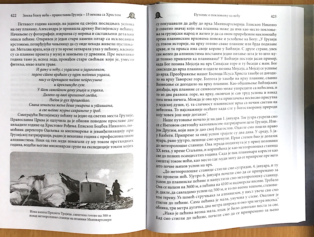 Ово је прва књига на србском језику у којој се излаже духовна прошлост и садашњост Грузије, са житијима њених подвижника и историјом проливања крви за Христа Васкрслог и Васкрситеља. Кроз текстове архимандрита Рафаила Карелина, Лазара Абашидзеа и других, србски читалац упознаје свештене тајне кавкаских гора, Богом сазданих да буду ваплоћени символ лествице ка небу описане у делу св. Јована, игумана Синајског. Преподобни, мученици, свети владари, јуродиви Христа ради, пролазе пред нашим духовним оком и буде у нама жељу да се придружимо онима који су већ стигли у небеску Грузију и небеску Србију. Духовни поглед са Кавказа који нам ова књига пружа велика је утеха и на да у доба у коме живимо.