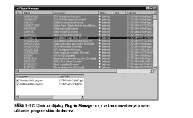 Komanda Plug-in Manager otvara okvir za dijalog istog imena koji sadrži detaljnu listu svih uèitanih programskih dodataka. U tom okviru za dijalog (slika 1-17) nalaze se imena, opis, velièina i putanja svakog programskog dodatka.