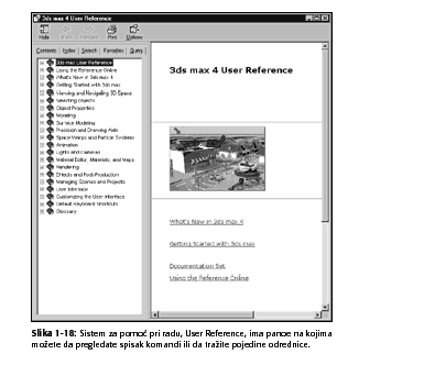 Meni Help je vredan putokaz za pristupanje referentnom materijalu i vežbanjima. User Reference (slika 1-18) i MAXScript Reference su dva referentna "priruènika" èija je pomoæ prilikom rada neprocenjiva.