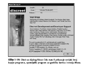 Komandom Tutorial uèitavate vežbanja, što vam daje priliku da steknete korisna iskustva. Additional Help je sistem pomoæi za sve uèitane spoljne programske dodatke. Komanda Connect to Support and Information automatski otvara èitaè Weba i u njega uèitava Web strane Discreet Support. Komanda About 3D Studio Max otvara okvir za dijalog About (slika 1-19). Taj okvir za dijalog prikazuje serijski broj kopije programa i upravljaèki program za grafièku karticu.