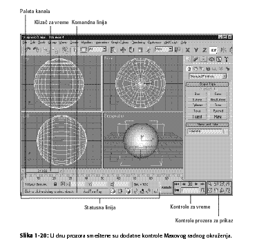 Pri dnu Maxovog prozora ima više elemenata koji omoguæavaju da tokom rada u programu upravljate prikazom. Ti elementi (slika 1-20) jesu kontrole za upravljanje prozorima za prikaz (Viewport Navigation Controls), kontrole za vreme (Time Controls), paleta kanala (Track Bar), statusna linija (Status Bar), komandna linija (Prompt Line) i prozor za makroe i skriptove (MAXScript Listener). U ovom odeljku objašnjavam rad sa svakim od njih.