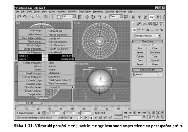 Priruèni meniji do kojih dolazite tako što pritisnete desni taster miša uvek su bili deo Maxovog radnog okruženja, ali je u Maxovoj verziji 4 njihova funkcija uveliko proširena. Kada desnim tasterom miša pritisnete unutar aktivnog prozora za prikaz, otvoriæe se (najviše) èetiri priruèna menija raspore?ena oko kursora. Sadržina menija zavisi od objekta koji ste pritisnuli. È;etiri podrazumevana menija (slika 1-21) su: Display, Transform, Tools1 i Tools2.