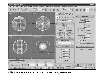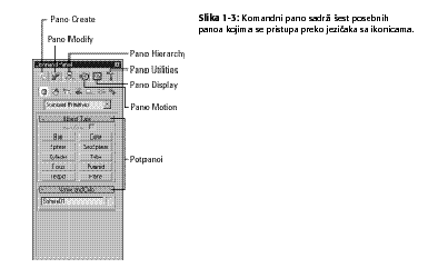 Ako Maxovo radno okruženje ima dušu, ona je na komandnom panou. Tu je smeštena veæina njegovih funkcija i parametara. Funkcije programa razdeljene su na šest panoa koji se otvaraju pritiskanjem odgovarajuæih jezièaka sa ikonicama pore?anim duž gornje ivice komandnog panoa. Tih šest jezièaka otvara panoe: Create, Modify, Hierarchy, Motion, Display i Utilities. Komandni pano je prikazan na slici 1-3.