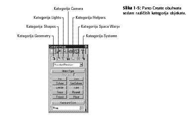 Pano Create koristite za pravljenje razlièitih objekata scene. Pano obuhvata više kategorija i potkategorija objekata. Kategorije na slici 1-5 prikazane su kao ikonice neposredno ispod jezièaka komandnog panoa. Tu su sledeæe kategorije: Geometry, Shapes, Lights, Cameras, Helpers, Space Warps i Systems. Potkategorije su svrstane na padajuæoj listi koja se nalazi ispod ikonica kategorija. O potkategorijama æu govoriti u odgovarajuæim posebnim poglavljima.