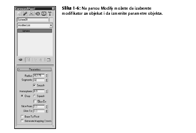 Pomoæu panoa Modify (slika 1-6) možete da primenite modifikatore na izabrani objekat. Modifikatori su funkcije koje objekte menjaju na unapred odre?en naèin. Modifikatori se mogu podešavati preko parametara na komandnom panou. Svi modifikatori koji su primenjeni na odre?eni objekat prikazuju se na listi primenjenih modifikatora Modifier Stack koja se nalazi pri vrhu panoa Modify. Modifikatorima pristupate preko menija Modifier ili birajuæi ih sa liste modifikatora (Modifier List).