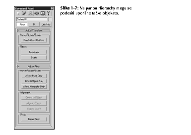 Pano za podešavanje hijerarhije (Hierarchy Panel), koji je prikazan na slici 1-7, sadrži tri dugmeta: Pivot, Inverse Kinematics i Link Info. Dugme Pivot omoguæava da premestite i preorijentišete uporišnu taèku (engl. pivot point) objekta oko koje se vrše transformacije. Inverzna kinematika (engl. Inverse Kinematics) je metoda kojom se definišu veze izme?u pojedinih delova objekta da bi se postiglo lakše animiranje.
