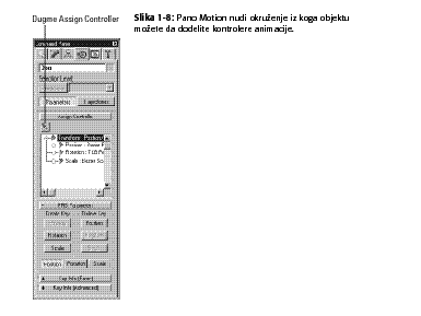 Pano za animiranje objekata (Motion Panel), prikazan na slici 1-8, ima dva dugmeta: Parameters i Trajectories. Kretanje objekta se obièno podešava primenom kontrolera (Controllers) i ogranièivaèa (Constraints). Dugme Parameters otvara okruženje u kome možete da pristupite kontrolerima i ogranièivaèima animacije. Kontroleri odre?uju položaj, rotaciju i promenu velièine objekata na unapred utvr?en naèin, a ogranièivaèi obuzdavaju kretanje objekta. Listu kontrolera možete da dosegnete ako pritisnete dugme Assign Controller smešteno u vrhu potpanoa Assign Controller ili komandom Animation ➪ Constraints.