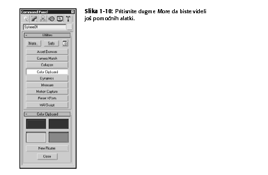 Pano sa pomoænim alatkama (Utilities Panel), koji je prikazan na slici 1-10, sadrži èitavu lepezu razlièitih alatki: Asset Manager, Camera Match, Measure, Dynamics, Motion Capture i MAXScript. Kada pritisnete dugme More, pojaviæe se dodatne alatke. Kada neku alatku želite da koristite, pritisnite dugme sa njenim imenom ili je izaberite sa liste. Ove alatke primenjujete u razlièite svrhe tokom rada, te je njihova funkcija objašnjena u nekoliko poglavlja u knjizi.