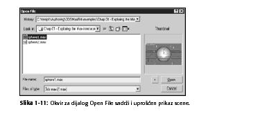Meni File sadrži standardne komande za rukovanje datotekama scena: New (Ctrl+N), Open (Ctrl+O), Save (Ctrl+S) i Save As. Svi okviri za dijalog koji rade sa Maxovim scenama sadrže i uprošæen prikaz aktivnog prozora (slika 1-11). On spreèava da otvorite pogrešnu scenu. Ako pri otvaranju scene Max ne može da prona?e njene resurse (npr. mape), pojavljuje se okvir za dijalog u kome možete da ga ruèno dovedete do pravog mesta, a tako?e možete i da te resurse ne uèitate.