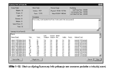 Komandom Summary Info možete da prikažete sve relevantne detalje o tekuæoj sceni, kao što su broj objekata, svetlosnih izvora i kamera, ukupan broj temena i površina, kao i razlièite parametre modela, a prikazuje se i polje Description u kome možete da opišete scenu. Slika 1-12 prikazuje okvir za dijalog Summary Info.