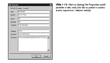 Komanda File ➪ File Properties otvara okvir za dijalog File Properties. Ovaj okvir za dijalog, prikazan na slici 1-13, sastoji se od tri kartice: Summary, Contents i Custom. Na karticama su podaci, kao što su naslov (Title), predmet (Subject) i ime autora (Author) Maxove datoteke, koji su zgodni ako na projektu radi više saradnika. Na primer, na kartici Custom možete da unosite datume revizije scene.