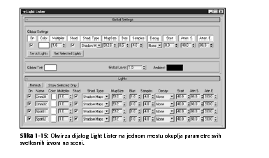 Komanda Light Lister otvara istoimeni okvir za dijalog, prikazan na slici 1-15, u kome jednim pogledom možete da obuhvatite podatke za sve svetlosne izvore na sceni. Vrednosti parametara u ovom okviru za dijalog možete i da menjate. Okvir sadrži i dva potpanoa: Global Settings, sa parametrima koji utièu na sve svetlosne izvore, i Lights, sa parametrima za svaki pojedinaèan svetlosni izvor.