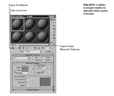 Editor materijala (slika KV-4) omoguæava da pravite, menjate i primenjujete materijale na objekte scene.