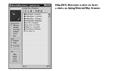 Otvoriæe se okvir za biranje materijala i mapa (Material/Map Browser), prikazan na slici KV-5. Kada ste u njemu, možete da uèitate biblioteku unapred definisanih materijala.
