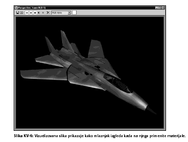 ActiveShade Floater. Otvoriæe se plutajuæi prozor ActiveShade u kome æe biti vizuelizovana slika aviona iz aktivnog prozora za prikaz. Pri vizuelizovanju scene izraèunavaju se efekti osvetljenja, materijal i okruženje i sve se komponuje u jedinstvenu sliku. Taj proces može da potraje neko vreme, u zavisnosti od toga koliko je scena složena, ali se isplati èekati jer je ActiveShade prozor u kome možete brzo da vidite rezultate primene materijala i svetlosnih izvora. Prozor ActiveShade vizuelizuje model mlaznjaka koristeæi jednostavne materijale i prikazuje ga na crnoj pozadini, što baš ne odgovara stvarnosti. Pa ipak, ne brinite; tek ste poèeli. Prozor ActiveShade možete da zatvorite pritiskajuæi njegovo dugme Close u gornjem desnom uglu.