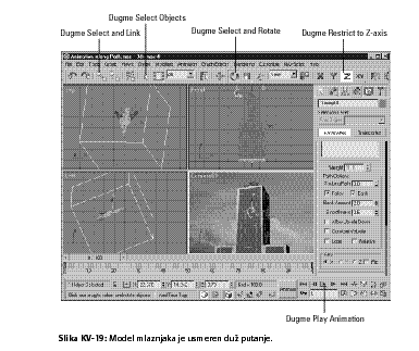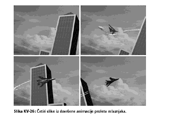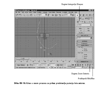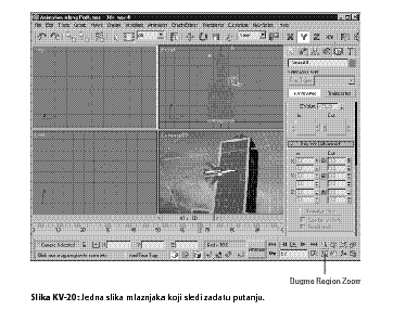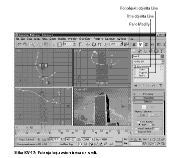 Slika KV-20 prikazuje avion kako se kreæe duž putanje. Ako pogledamo kljuène slike animacije, možemo da dobijemo utisak kako æe animacija da izgleda na kraju. Na taj naèin, ako su neophodne izmene, mirno se možemo vratiti panou Modify da bismo izmenili putanju.
