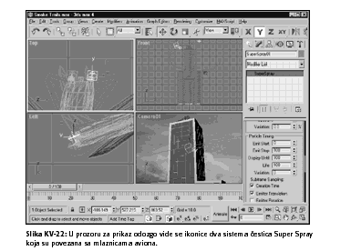 Kada uveæate prozore za prikaz sleva i odozgo (možda æete morati ponovo da upotrebite dugme Region Zoom da biste u prozor doveli mlaznicu aviona), otvorite pano Create, pritisnite dugme kategorije Geometry (prvo dugme sleva) i sa padajuæe liste izaberite potkategoriju Particle Systems. Zatim pritisnite dugme Super Spray i povucite mišem unutar prozora sa prikazom odozgo da biste na scenu uneli sistem èestica Spray.