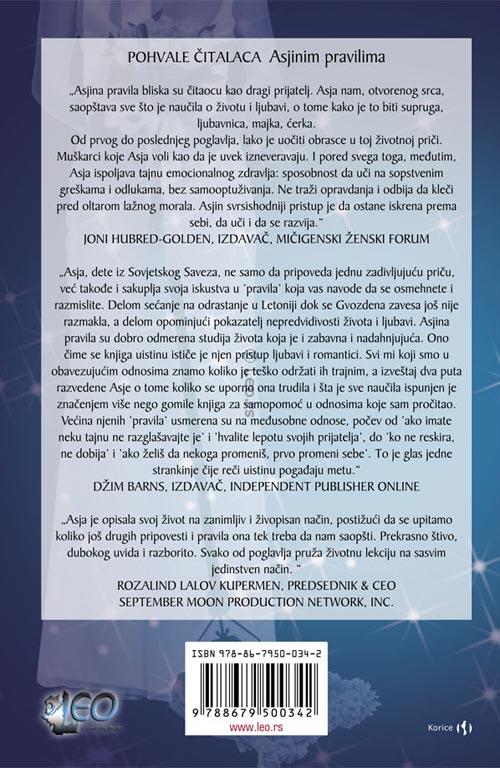 Sa svojevrsnom razboritošću i nepopustljivom iskrenošću, Asja Raines je napisala jednu divnu životnu priču od koje zastaje dah. Asjina pravila vode čitaoce na putovanje sa jednom odvažnom Letonkom od njene mlađane zrelosti u osiromašenoj i ugnjetenoj otadžbini do obećanog novog života i trajne ljubavi, polovinu zemljine kugle odatle, u Americi. Daleko od bajkovitosti iz njenih snova, njeno putovanje je hodočašće koje stavlja na probu krajnje granice njene izdržljivosti, ličnosti, ljubavi i strpljenja.
