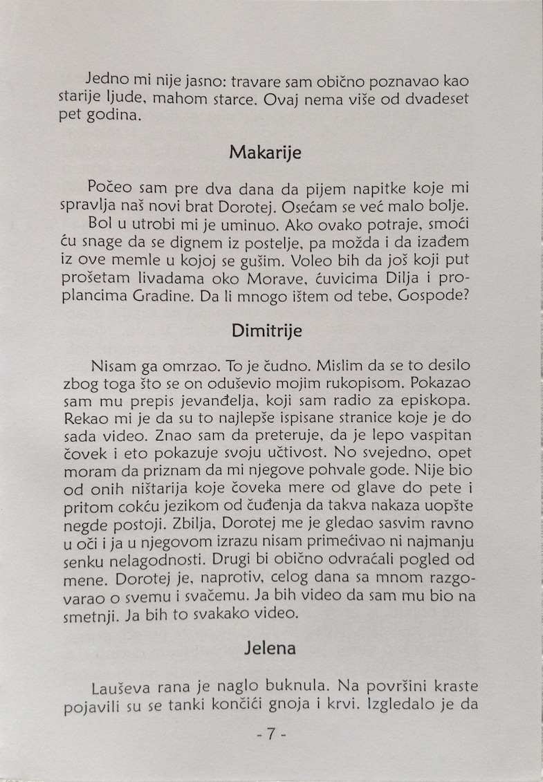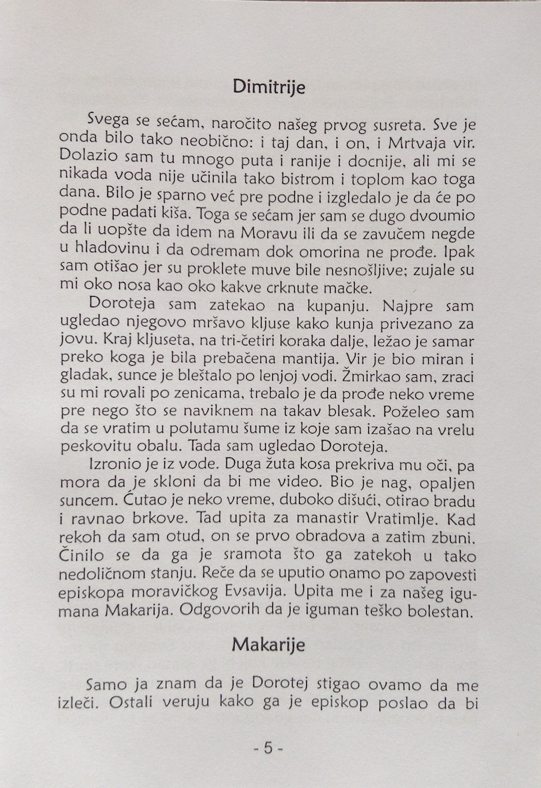 He emerged from the water. His long, blond hair covered his eyes, so he had to remove it from his eyes to be able to see me. He was naked, sun-tanned. For a while he was silent, breathing deeply, wiping his beard and straightening his moustache. Then he asked about the monastery of Vratimlje. When I replied that I came from there, at first he was glad and then, embarrassed. It seemed he was ashamed to be found in such an inappropriate situation. He said he was heading there at the command of the Moravian bishop Evsavius. He also wanted to know about our abbot Macarius. I replied that the abbot was gravely ill.