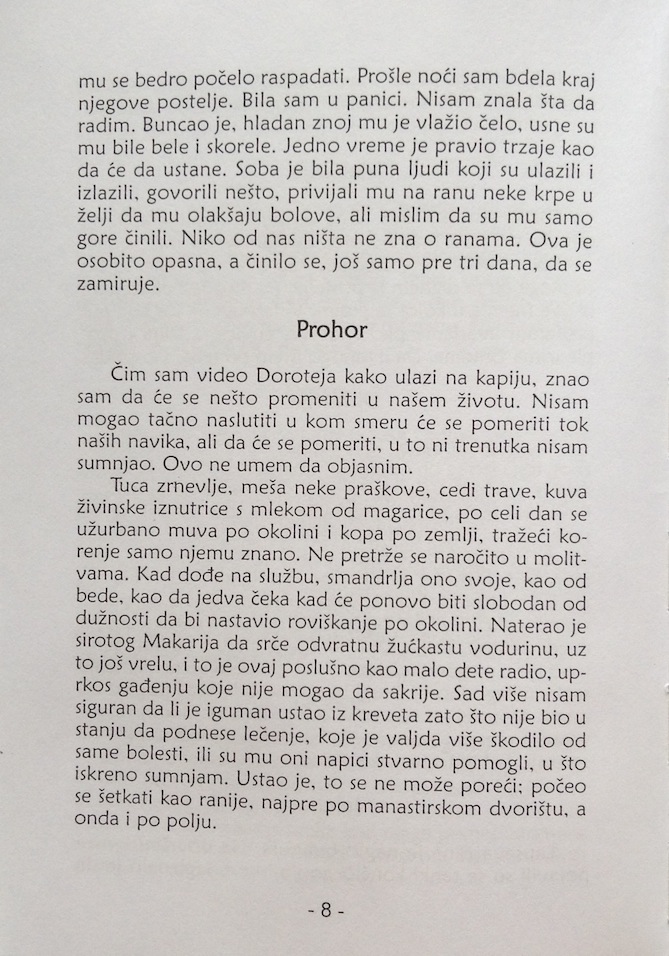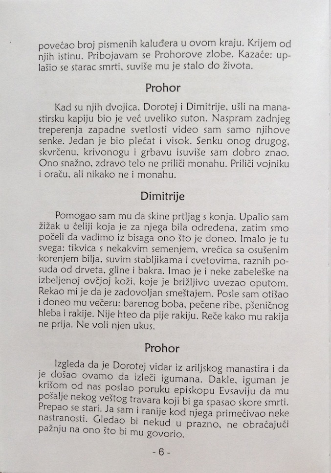 It seems that Dorotheus is a herbal healer from the monastery of Arilje and that he has come here to cure the Prior. So, the abbot secretly dispatched a message to the Bishop Evsavius asking him to send a skilful herbal healer who would save him from impending death. The old man has got scared. I have noticed such oddities in his behaviour before. Occasionally he has stared blankly, ignoring what I was telling him.
