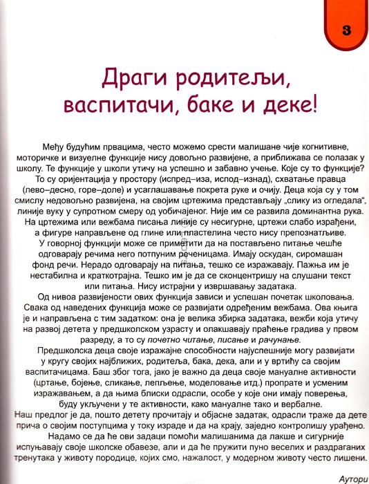 Ova knjiga je velika zbirka zadata i vežbi koji utiču na razvoj deteta u predškolskom uzrastu i olakšavaju praćenje gradiva u prvom razredu, a to su početno čitanje, pisanje i računanje. Zadaci u knjizi pomoćiće mališanima da lakše i sigurnije ispunjavaju svoje školske obaveze, ali će im pružiti i puno veselih i razdraganih trenutaka u životu porodica i drugara koji će sa njima učiti i igrati se.