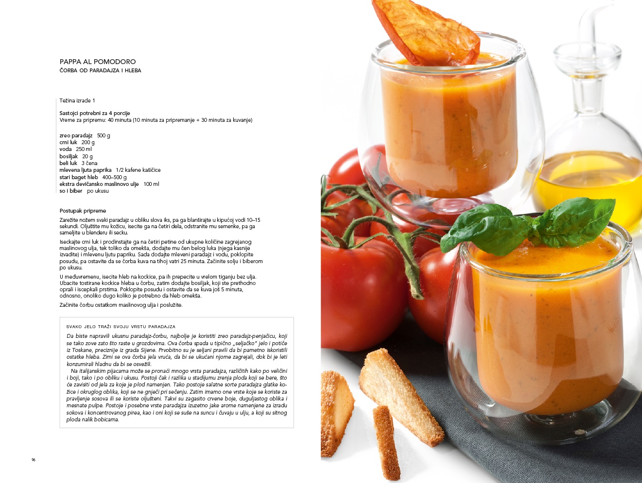 Italijanska kuhinja je nastala od jednostavnih jela, čiji su se recepti generacijama usmeno prenosili unutar porodica, pa su iz takve tradicije stigli u restorane. Upravo zato ova knjiga nije samo običan kuvar, već i neverovatna priča o Italiji, njenoj istoriji, običajima i kulturi. Dragocena je ne samo zato što obiluje savetima i korisnim informacijama, već i zbog sveobuhvatnosti i istorijske kompletnosti.