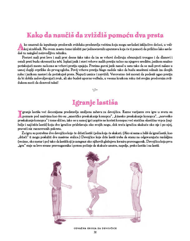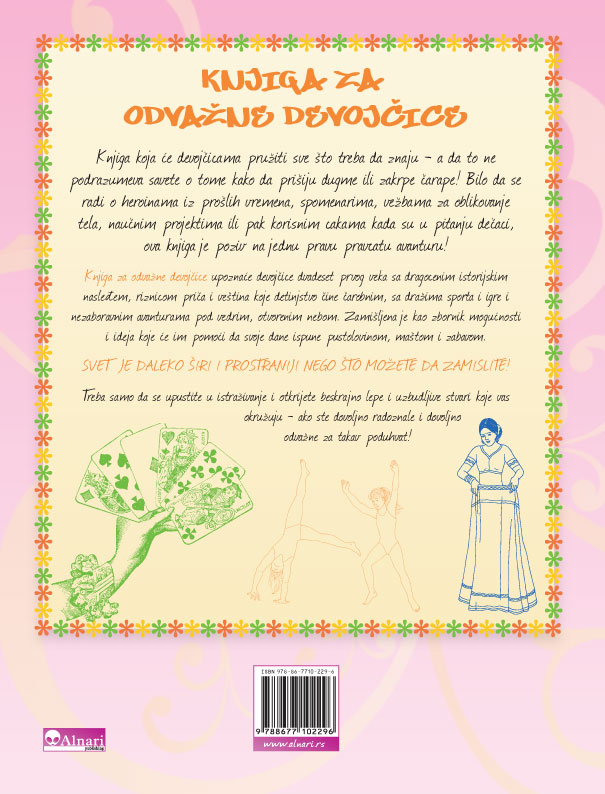 Knjiga koja će devojčicama pružiti sve što treba da znaju – a da to ne podrazumeva savete o tome kako da prišiju dugme ili zakrpe čarape! Bilo da se radi o ženama herojima iz prošlih vremena, spomenarima, vežbama za oblikovanje tela, naučnim projektima ili pak korisnim cakama kada su u pitanju dečaci, ova knjiga je poziv na jednu pravu pravcatu avanturu! Knjiga za odvažne devojčice upoznaće devojčice dvadeset prvog veka sa dragocenim istorijskim nasleđem, riznicom priča i veština koje detinjstvo čine čarobnim, sa dražima sporta i igre i nezaboravnim avanturama pod vedrim, otvorenim nebom. Zamišljena je kao zbornik mogućnosti i ideja koje će vam pomoći da svoje dane ispunite pustolovinom, maštom i zabavom. Svet je daleko širi i prostraniji nego što možete da zamislite! Treba samo da se upustite u istraživanje i otkrijete beskrajno lepe i uzbudljive stvari koje vas okružuju – ako ste dovoljno radoznale i dovoljno odvažne za takav poduhvat!