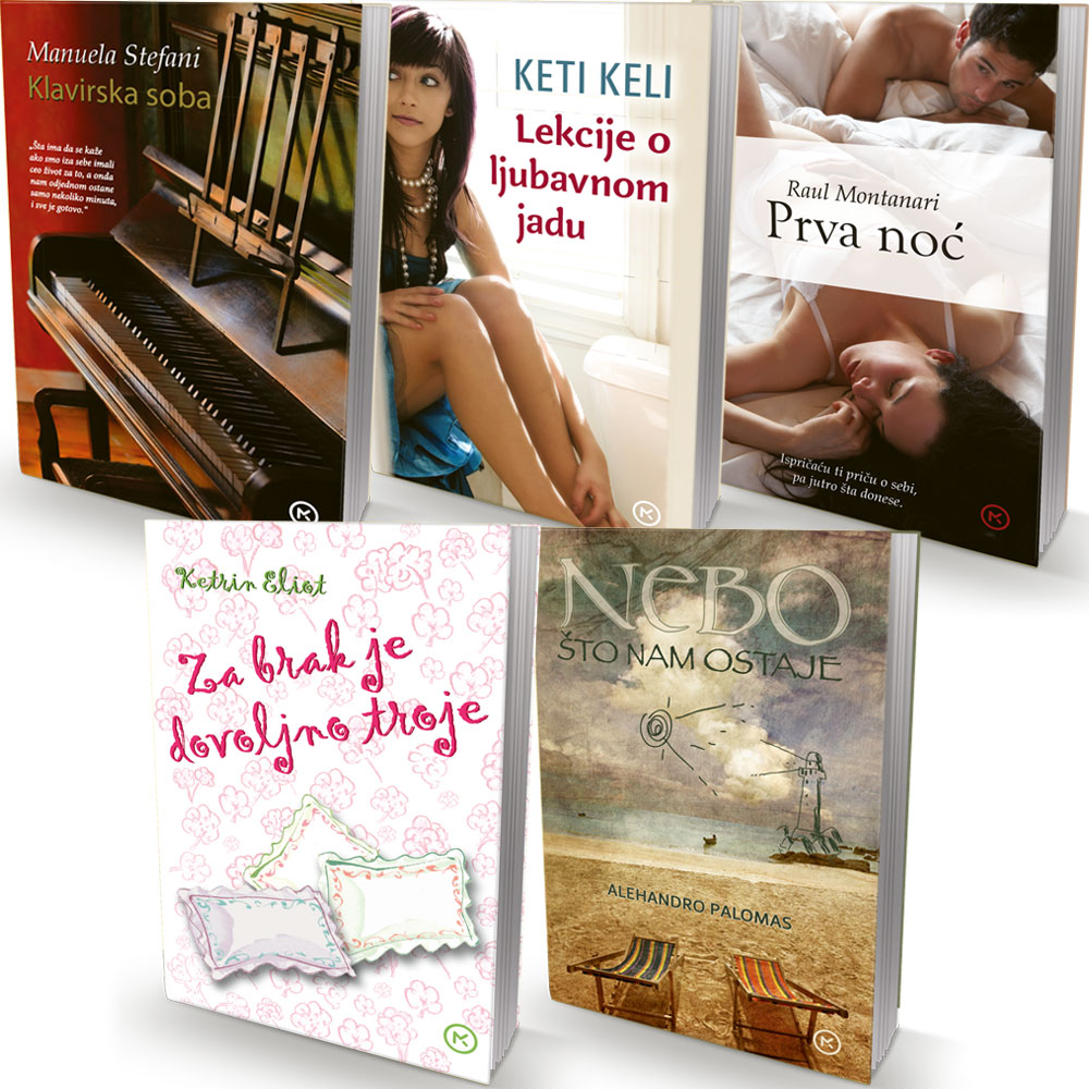 Klavirska soba "Šta ima da se kaže ako smo iza sebe imali ceo život za to, a onda nam odjednom ostane samo nekoliko minuta i sve je gotovo." Danijele i Bjanka poznaju se još od detinjstva. Ona je gimnastičarka i slikarka, a on pijanista. Čitave dane spokojnog detinjstva jedno drugom su društvo, uteha i podrška. Ali Danijele bi hteo da budu i nešto više, dok Bjankino mlado srce mašta o nečemu drugačijem što će doći i odvesti je u neki novi život, suviše neiskusna da na vreme prepozna pravu ljubavi i ceni osećanja koje je Danijele prema njoj gajio. Lekcije o ljubavnom jadu Velika prica o tome kako je ljubav sve cak i kad nije dovoljna... Tri žene razlicitih generacija. Tri ljubavi. Tri razloga što je moralo da se ode. Za Brak je dovoljno troje U braku umetnice Imodžen Kameron već ih je troje – ona, njen suprug Aleks i njihov devetogodišnji sin Rufus – i to je baš ono što joj odgovara. No sve će se to promeniti... Prva noć "Prva noć je roman noar pitak kao hladno pivo ili koka-kola, zavisi od sklonosti, ali svakako je hranjiv, a ne goji. Hrani pre svega jedan san: da muškarci i žene mogu jednog dana da nauče da razgovaraju ili barem da slušaju jedni druge." Darija Binjardi Nebo što nam ostaje Pet žena sa Menorke, godinu i po dana posle tragične smrti šestogodišnjeg Tristana, ponovo se sastaju, u Kopenhagenu, da zajedno proslave Božić. Pored velike radosti koju im pričinjava ponovni susret, sve junakinje strepe od dugo izbegavanih pitanja koja bi ih naterala da se suoče sa velikim bolom i ponovo uhvate nit života koji neumitno teče svojim tokom.