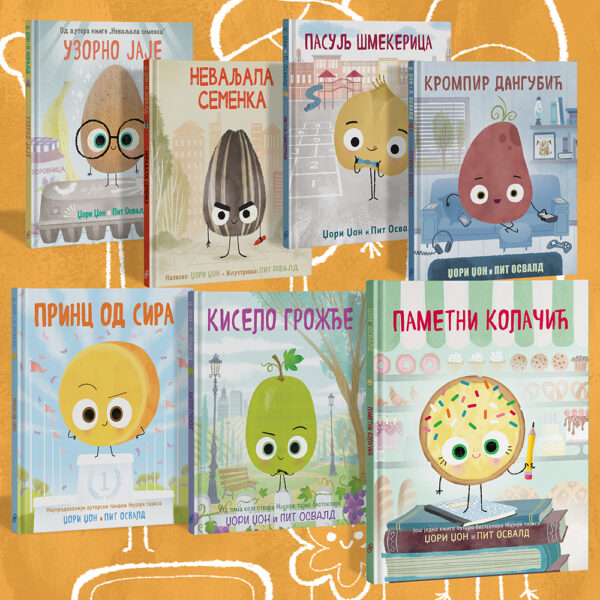 Ediciju (dečjih) knjiga o razvoju emocionalne inteligencije čini sedam legendarnih naslova: Uzorno jaje , Nevaljala semenka , Pasulj šmekerica , Krompir dangubić , Princ od Sira, Kiselo grožđe i Pametni kolačić . Poučne priče u stihu praćene šik ilustracijama govore o gorućim temama za odrastanje : o pritisku koji ide ruku pod ruku s perfekcionizmom i značaju prihvatanja sebe i drugih, o načinima na koje loša iskustva utiču na našu ličnost, o tome kako biti povučen ne znači biti nevidljiv, a biti KUL znači biti pristojan i ljubazan, o opasnostima preteranog gledanja u ekrane, o suočavanju sa porazom, o ljutnji koja nekad ume da nas zaslepi, pa zaboravimo da uvažimo i tuđe perspektive o samopouzdanju i spoznaji sebe. Odaberite svog favorita i smejte se, pričajte, pitajte se i rastite čitajući zajedno s decom. Tekst: Džori Džon Ilustrator : Pit Osvald Prevod sa engleskog: Sandra Dosković Ognjenović Povez: tvrd Broj strana knjiga: 40 Format knjiga: 23,5 x 28,5 cm Uzrast: 4-9 godina Opis Ediciju knjiga o razvoju emocionalne inteligencije kod dece čini 7 naslova: Nevaljala semenka, Uzorno jaje, Pasulj šmekerica, Krompir dangubić, Princ od Sira, Kiselo grožđe i Pametni kolačić. Nevaljala semenka je poučna priča o semenki koja je sticajem nesrećnih okolnosti ostala sama i napuštena. Rasla je u srcu jednog žutog cveta i živela srećno sa svojom porodicom, sve dok nije dospela u mračnu vreću, a odatle i u usta jednog džina. Iako se pukom srećom spasla, taj događaj promenio je ovu semenku. Bila je puna besa, prestala je da se smeje, izgubila prijatelje i lutala bez cilja. Pošto više nije živela u svom cvetu, bilo je baš briga za sve na ovom svetu. Prema svima je postala bezobrazna i zla. Ali onda je shvatila… Odlučila sam da ne želim više da budem nevaljala i zla, umorila me je uloga ta. Moram nešto da promenim u svom životu! Vreme je da opet potražim radost i lepotu! Uzorno jaje je genijalna knjiga o jajetu za koje su pristojnost i dobrota oduvek bili sastavni deo života. Međutim, jednog dana je završilo u kartonskoj kutiji sa još 11 jaja, veoma loše vaspitanih jaja. Ovo uzorno jaje nije moglo da izdrži, pa se stalno trudilo da sve drži pod kontrolom i ispravlja tuđa nedela. Ali nikog nije bilo briga… Tada su se na njegovoj ljusci pojavile pukotine i jaje je konačno shvatilo da je lepo brinuti o drugima, ali da isto tako moramo misliti i na sebe i svoje potrebe. Doslovno sam pukao! Dosta mi je te brige i nemoći! Došlo je vreme da nešto promenim. Moram sam sebi pomoći! Pasulj šmekerica – knjiga koja promoviše ljubaznost, pristojnost i lepe manire. Ne tako davno, ekipa pasulja živela je u istoj mahuni. Sasvim različiti, ali složni, uživali su svakog trena. A onda je sve to nestalo i njihovo drugarstvo je tek tako prestalo. Naš junak je iz prikrajka gledao kako njegovi drugari postaju popularni, kako im se svi dive jer su mnogo kul. Jedan svira gitaru, drugi savršeno crta, treći izvanredno igra košarku. Ali njemu ništa nije išlo. Za svaku igru poslednjeg bi ga izabrali. Bio je nespretan, nimalo kul izgleda, groktao je kada se smeje… Počeo je da misli da nije vredan i prestao je da se trudi… Važno je pažljiv i ljubazan biti, nekoga ohrabriti, nekome u nevolji ruku pružiti. Krompir dangubić – u ovoj urnebesnoj priči saznaćete kako se jedan lenji krompir pokrenuo i otkrio realan svet izvan ekrana. Ova knjiga uči nas da je potrebno naći balans između vremena provedenog ispred ekrana i spoljašnjeg sveta koji može da ponudi bezbroj razloga za sreću. Naš junak dane provodi tako što se po ceo dan izležava, igra igrice i uživa u svom svetu ne izlazeći nikada iz kuće. On tu ima sve što mu treba: udoban kauč, slušalice, daljinski upravljač, video-kamere, telefon, računar, kokice… Posebno zadovoljstvo mu pruža mnoštvo ekrana na kojima gleda serije, igra igrice, čita poruke i komunicira sa prijateljima. On ne druži se sa drugarima napolju već virtuelno! Ali onda je jednom izašao da prošeta psa i shvatio koliko je realan svet prelep… Princ od Sira Princ od Sira je ubeđen da je najbolji u svemu, jer na svakom takmičenju odnese baš sve nagrade. Gde god se pojavi, svi se oduševljavaju. Dive mu se, baš ga obožavaju. U pozorištu je zvezda slavna. Na stadionu je atrakcija glavna. Kada ga ugledaju, uzbuđeni obožavaoci uzdišu za njim. Zovu ga Princ od Sira. Svi bi da ga vide, taknu, da mu mahnu. Blicevi sevaju, vilice padaju, svi žele da se slikaju s njim. A kako mu to uspeva? Lako! On se takmiči samo u onome u čemu je stvarno najbolji i nikada se ne upušta u nove, nepoznate stvari. Ali onda jednoga dana iznenada dobija ravnopravnu konkurenciju, potpuno drugačiju od njega. Sirko je stidljiv i nevidljiv, ćutljiv, i baš u svemu bolji od njega… Saznajte kako je ovaj krajnje neskroman sir naučio da postoje lepše i bolje stvari od konstantnog jurenja slave i titule najboljeg. Kiselo grožđe Ovo je priča o jednom grožđu koje je stalno bilo namrgođeno i ljuto. Zlopamtilo pravo. Ako ga neko uvredi, precrtaće ga zauvek. Ovo grožđe je prilično osetljivo i nema strpljenja više. Neka se niko ne kači s njim, jer loše mu se piše! Biti stalno ljut i nije baš lako. Ali nije oduvek bilo tako… Da li će iskrica zahvalnosti i nagoveštaj saosećanja biti dovoljni da jedno kiselo grožđe pretvore u slatko? Saznajte kako je samopoznaja pomogla jednom grožđu da sazri, u još jednoj svežoj, duhovitoj i hranljivoj priči iz popularne edicije najprodavanijih autora Njujorka tajmsa, Džorija Džona i Pita Osvlada. Pametni kolačić Ovo je priča o jednom pametnom kolačiću, koji se nije oduvek osećao baš tako… Jer biti samouveren nije uvek lako! Najnovije izdanje bestselera Njujork tajmsa donosi nam priču koja nas podseća da na bezbroj različitih načina možemo biti pametni i vredni – potrebno je samo da otkriješ ko si ti u stvari.