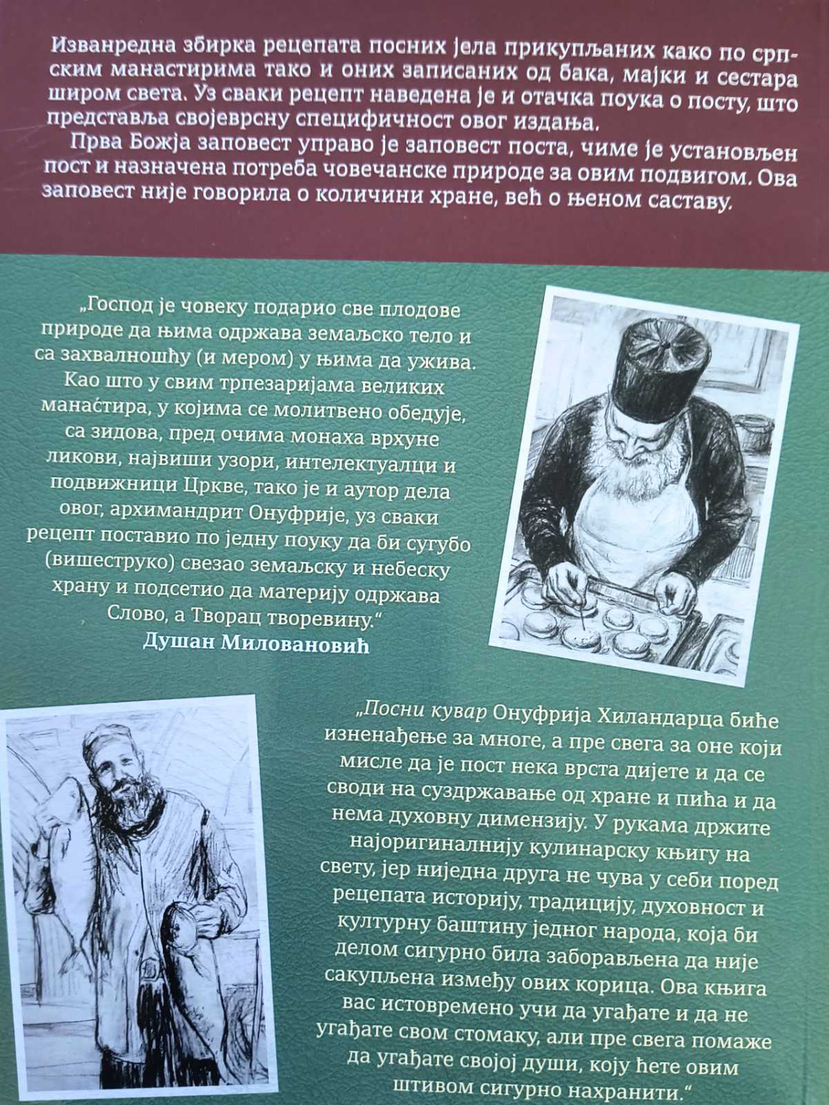 „Посни кувар Онуфрија Хиландарца биће изненађење за многе, а пре свега за оне који мисле да је пост нека врста дијете и да се своди на суздржавање од хране и пића и да нема духовну димензију. У рукама држите најоригиналнију кулинарску књигу на свету, јер ниједна друга не чува у себи поред рецепата историју, традицију, духовност и културну баштину једног народа, која би делом сигурно била заборављена да није сакупљена између ових корица. Ова књига вас истовремено учи да угађате и да не угађате свом стомаку, али пре свега помаже да угађате својој души, коју ћете овим штивом сигурно нахранити.“