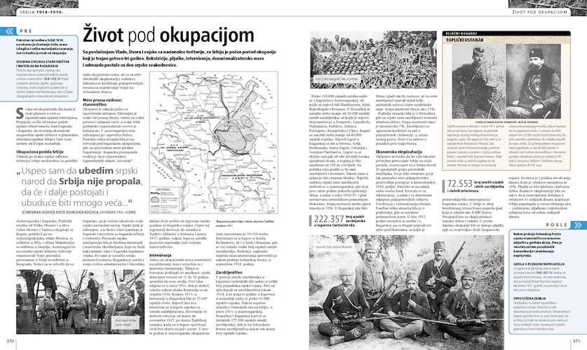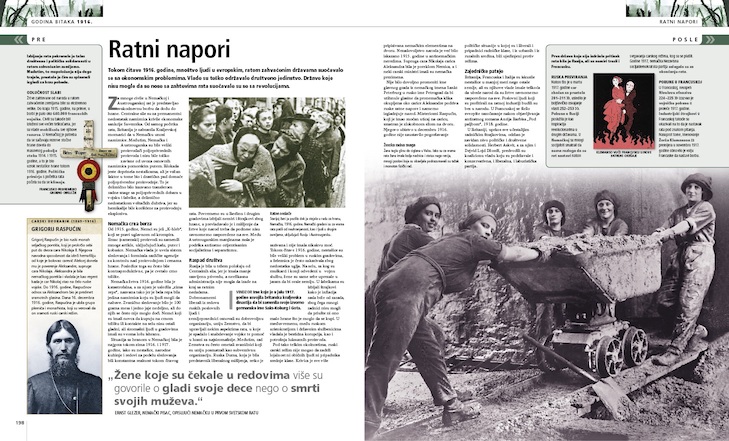 Skupo plaćeno učešće Srbije u Velikom ratu maestralno je predstavio srpski vojni istoričar dr Dalibor Denda, koji u autorskom tekstu čitalačkoj publici prijemčivim jezikom otkriva novi pogled na istorijske događaje. U delu Srbija 1914–1918. prikazane su velike pobede srpske vojske 1914. godine, njeno stradanje tokom povlačenja preko Crne Gore i Albanije, ali i vaskrs i nove pobede na Solunskom frontu 1916–1918. godine. Ubedljivi opisi epidemije tifusa, stradanja vojnika i civila u logorima i pod okupacijom, potkrepljeni svedočanstvima očevidaca, duboko se urezuju u pamćenje čitalaca. U tekstu je istaknut i doprinos srpskih dobrovoljaca iz Vojvodine, Bosne, Hercegovine, Like, Banije, Korduna, Dalmacije i Boke Kotorske trijumfu Srbije u Velikom ratu i dat je opis Topličkog ustanka kao jedine pobune u Evropi pod vlašću Centralnih sila. Pažljivo odabrane autentične i do sada retko korišćene ili potpuno nepoznate fotografije slavnog perioda srpske istorije dugo ostaju u sećanju i zato je PRVI SVETSKI RAT – VELIKI ILUSTROVANI VODIČ knjiga koja se izdvaja od ostalih.