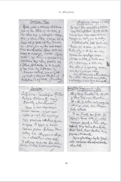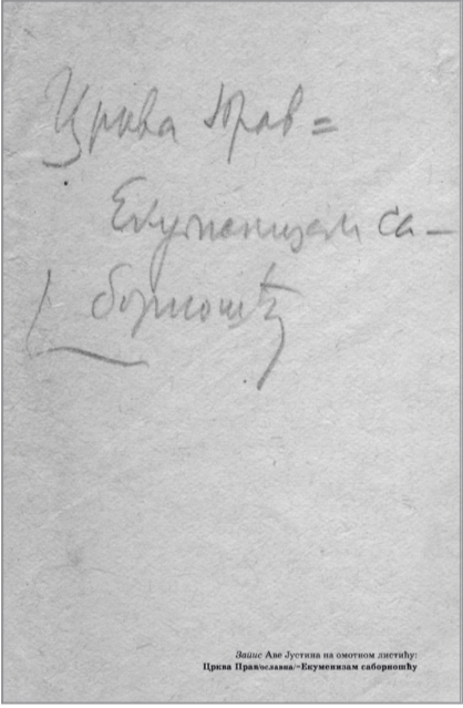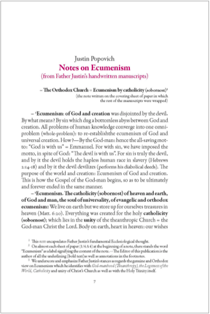 Justin’s manuscript legacy includes a parcel of sheets/small sheets of paper (in the ¼ A4 size) with the notes on ecumenism. It is easy to perceive that Father Justin while criticizing western type of ecumenism rejects neither the very notion of ecumenism nor the term itself, but rather renders it orthodox, churchifies, christifies, theohumanizes it, and instead of false, bare humanistic [ecumenism], puts forward Orthodox, evangelical, Theanthropic Ecumenism, wherein Christ in the Church, and in the Unity and Catholicity (sobornost) of the Orthodox Church, is in the center of all and everything.