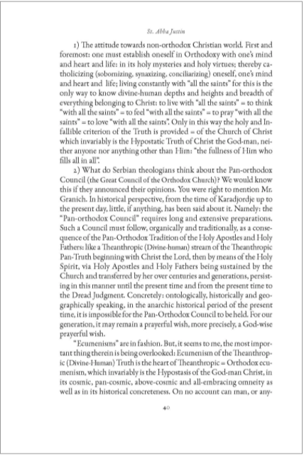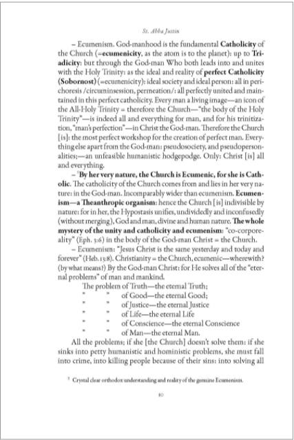 „Ecumenism is a movement that generates a multitude of questions. All there questions, in fact, spring from and flow into a single desire for only one thing> the True Church of Christ. The True Church of Christ supplies, as it should, the answers to all the primary and secondary questions posed by ecumenism. For if the Church of Christ does not solve the eternal questions of the human spirit, it serves no purpose… Ofall beings, man is the most complex and most enigmatic. This why God came down to earth and became man… For this reason He remained in His fullness on earth in His Church, of which He is the Head and which is His Body. The True Church of Christ, the Orthodox Church> in it is the whole God-Man with all His Good News and all His perfection.“